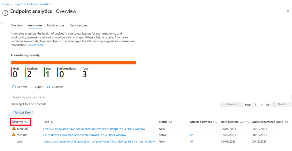 - Use the device timeline report to check for patterns, such as device restarts or updates tied to anomalies.
