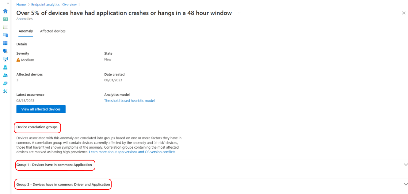 - To view more information about a specific anomaly, select it from the list. Review details such as the app name, affected devices, when the issue was first detected and last occurred, and any device groups that might be contributing to the problem.