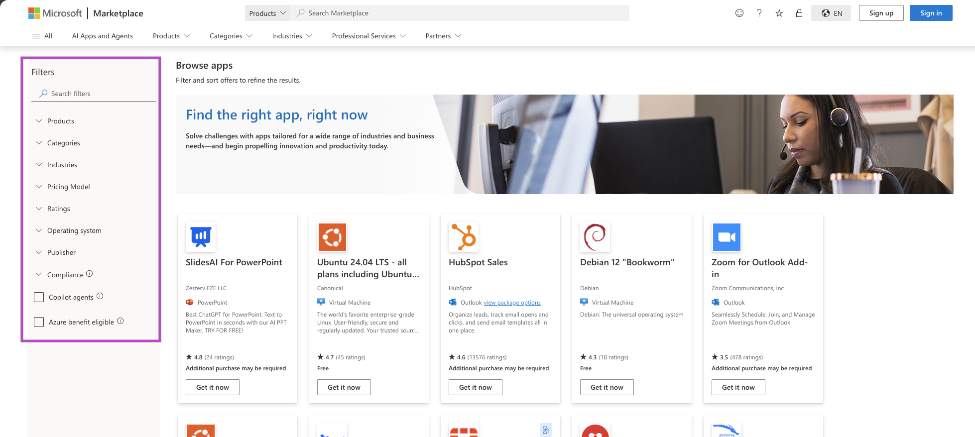 When exploring Microsoft Marketplace, use the filters on the left pane to narrow results based on product, category, the availability of a free trial, pricing model (free or paid), customer ratings, and compliance programs.