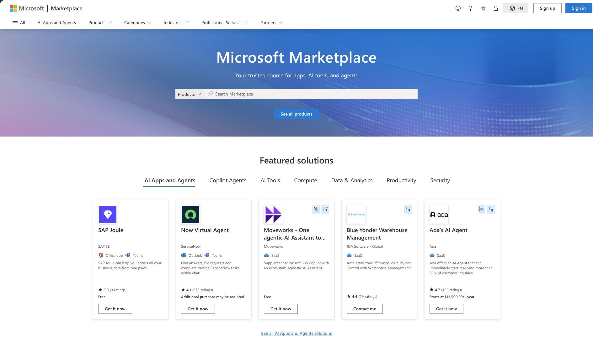 Microsoft Marketplace is your trusted source for cloud solutions and AI agents. Microsoft Marketplace offers a comprehensive catalog of solutions built on or built for Microsoft technologies, serving IT professionals, developers, and business users alike. With the new AI Apps and Agents category in Marketplace, you can discover AI apps and pre-built agents that address a wide range of scenarios and meet your unique needs.