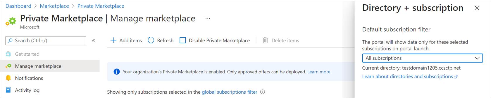 Subscription-based Private Offers are visible only for the listed subscriptions in the Private Offer settings. To view the Private Offer, ensure the global subscription filter is showing all the subscriptions.