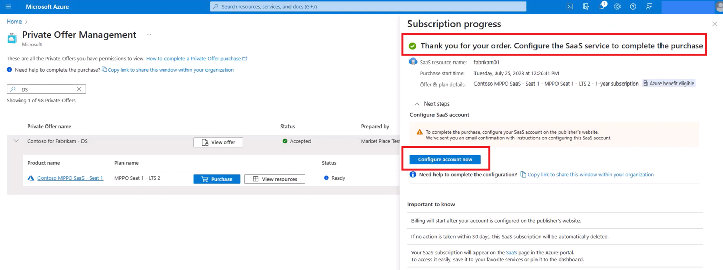 Once the SaaS offer deployment completes, configure the account on the partner website. Select Configure account now.