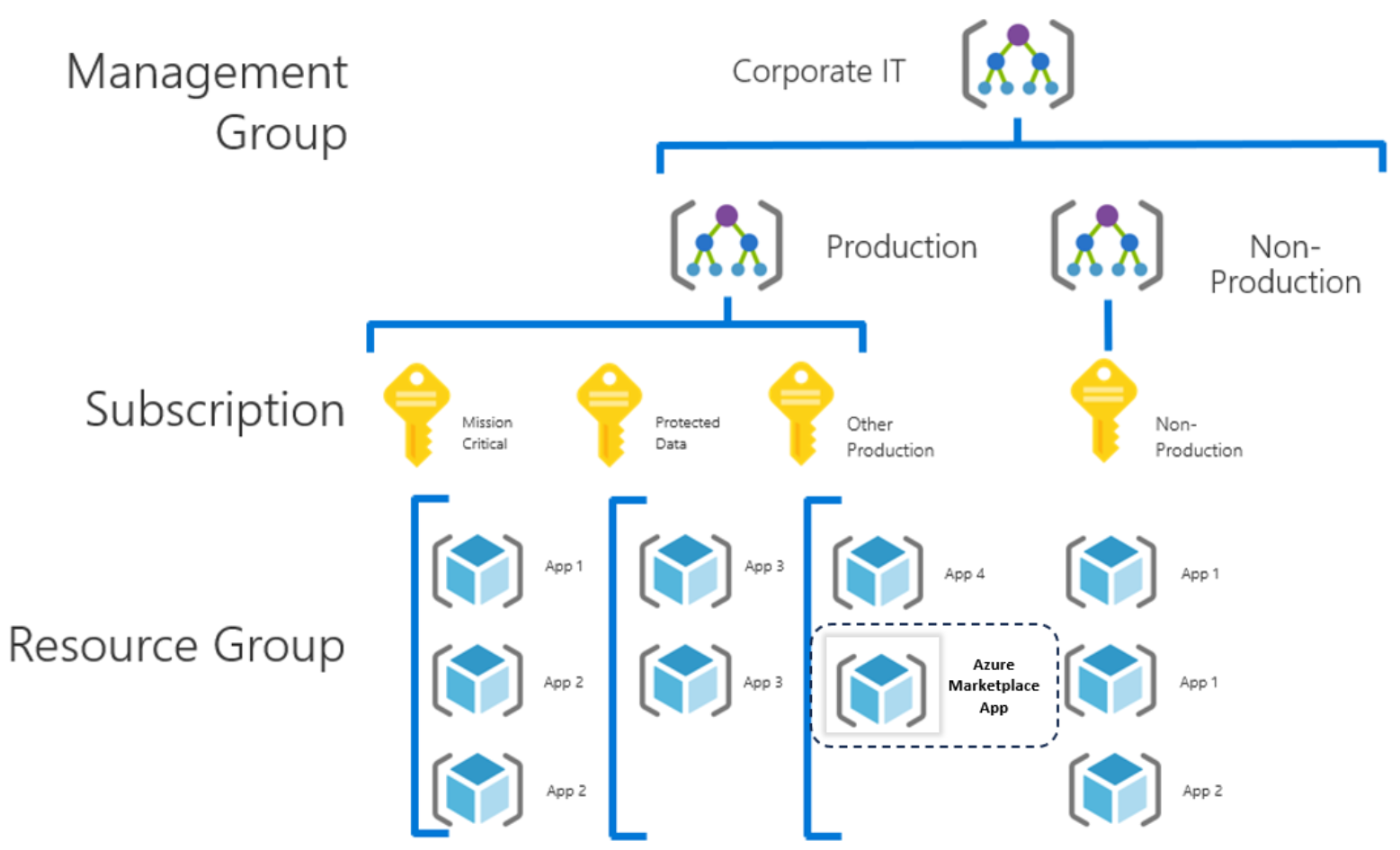 A well-structured organizational hierarchy helps you organize your cloud-based resources to procure efficiently from Microsoft Marketplace, manage, and track costs. Azure provides four levels of management: management groups, subscriptions, resource groups, and resources. These hierarchies can be tailored to meet organizational needs, whether they're functional, organizational, or based on testing and production environments.