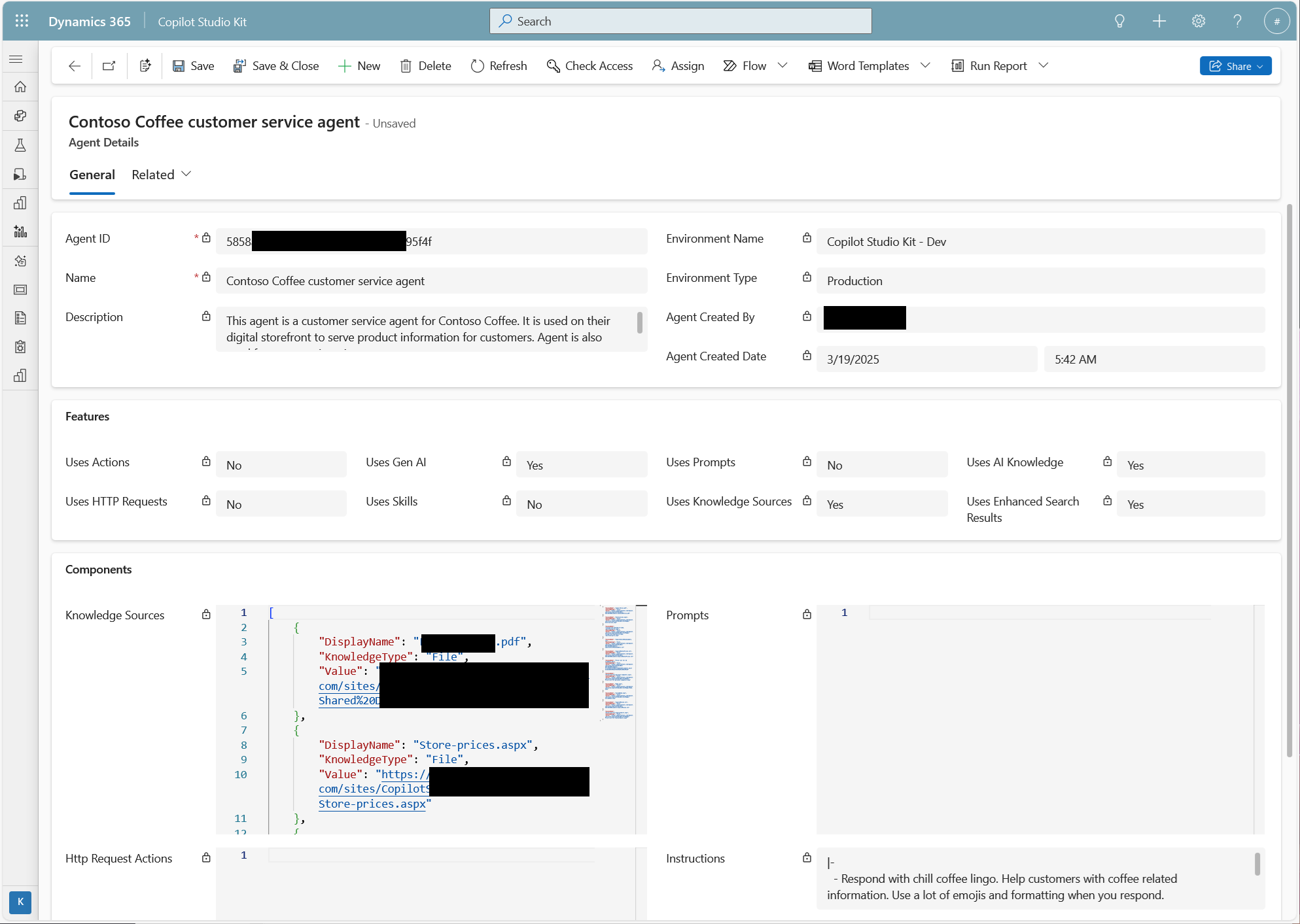 Select an agent and then select View details to see a detailed view of the selected agent. This view includes basic metadata about the custom agent, the environment, creation time, creator, and detailed information about the usage of features such as actions, generative AI, skills, prompts, and knowledge sources.