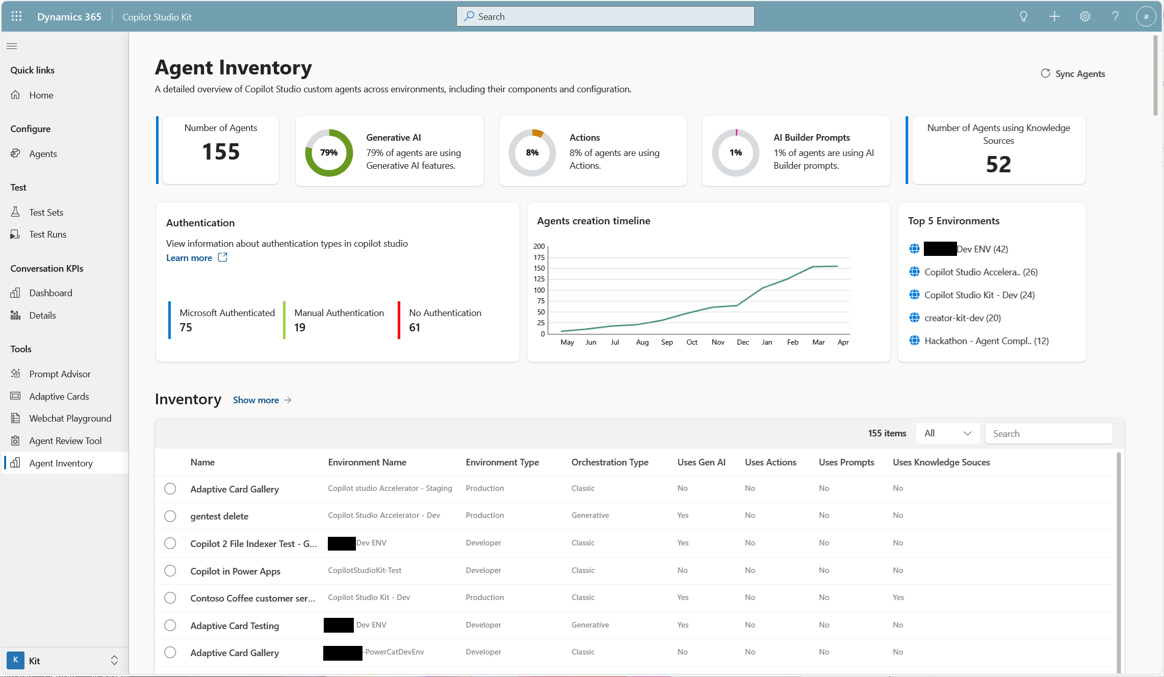 From the Agent Inventory dashboard, you can see the total number of agents in the tenant, the usage percentage of generative AI features, actions, prompts, and how many agents use knowledge sources. You can also see the authentication mechanism used by the custom agents, an agent creation timeline that visualizes the growth, and a list of the top five environments by agent count.