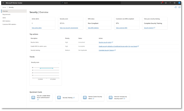 The Security workspace is a centralized platform within Partner Center that helps you assess and improve your security. Partners are expected to review the information in the Security workspace and take action to improve their security posture.