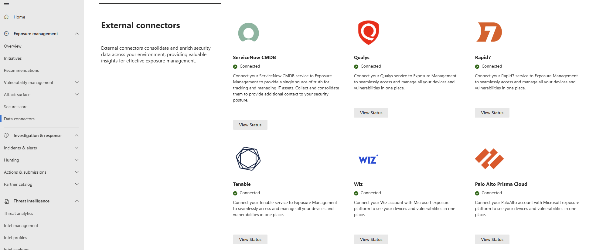 To provide coverage of all your assets and security signals and to help you establish a comprehensive, single source of truth for your assets, Exposure Management provides data connectors. These new Exposure Management connectors ingest data from third-party security tools (such as ServiceNow CMDB for assets, and Tenable, Qualys, Rapid7 for vulnerabilities) and other asset management products deployed in your environment.