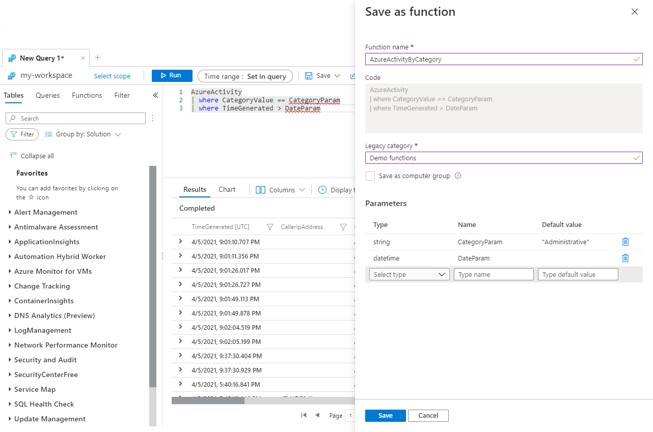 Introduceți Numele funcției ca AzureActivityByCategory Apoi creați doi parametri: