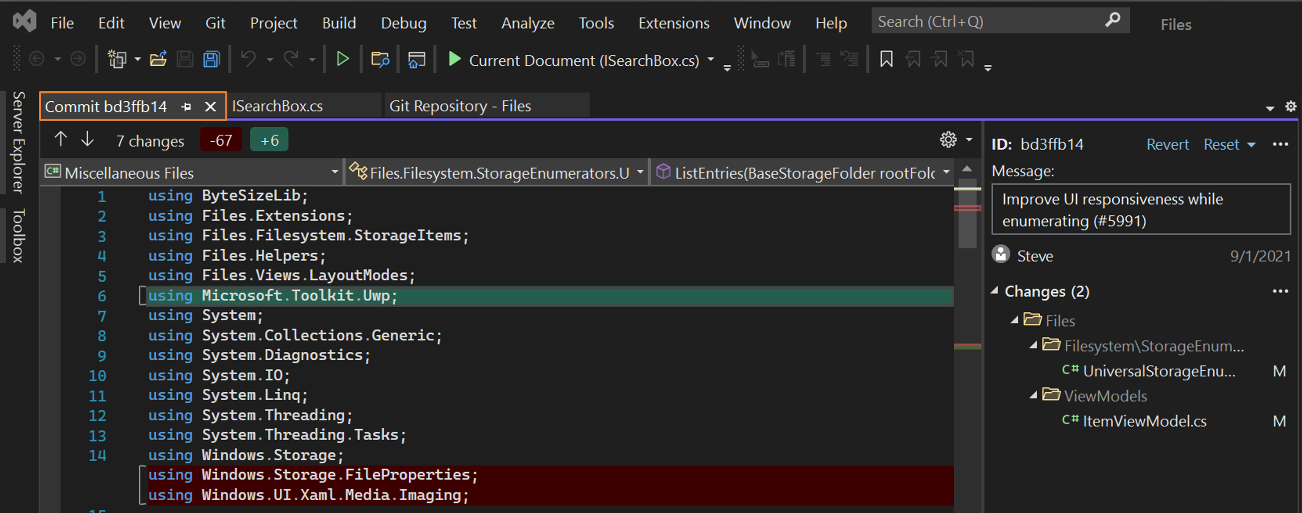 Commit: To open this section, select any commit in the Graph section. You can check the changes that a commit has introduced by selecting them, which shows a difference. For example, the previous screenshot shows the changes that one commit introduced to the Resize.cs file.