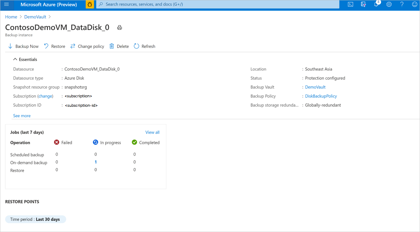 Теперь выберите связанные элементы , чтобы открыть панель мониторинга для экземпляра резервного копирования. Здесь можно просмотреть задания резервного копирования за последние семь дней.