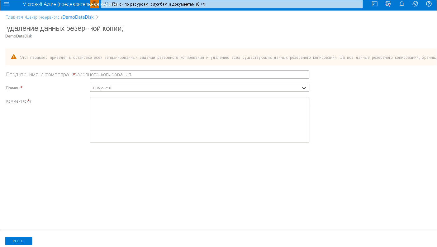 Укажите имя экземпляра резервной копии, причину удаления и другие комментарии.