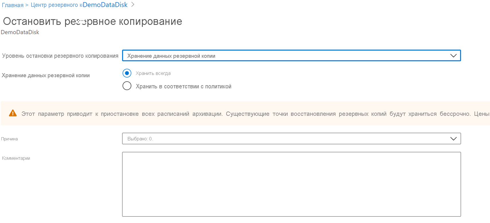 Остановить защиту и сохранить данные (сохранить навсегда): этот параметр помогает остановить все будущие задания резервного копирования от защиты сервера. Однако служба архивации Azure сохраняет точки восстановления, резервные копии которых создаются навсегда. Необходимо заплатить, чтобы сохранить точки восстановления в хранилище (см. информацию о ценах на Azure Backup). При необходимости вы можете восстановить диск. Чтобы возобновить защиту сервера, используйте параметр "Возобновить резервное копирование ".