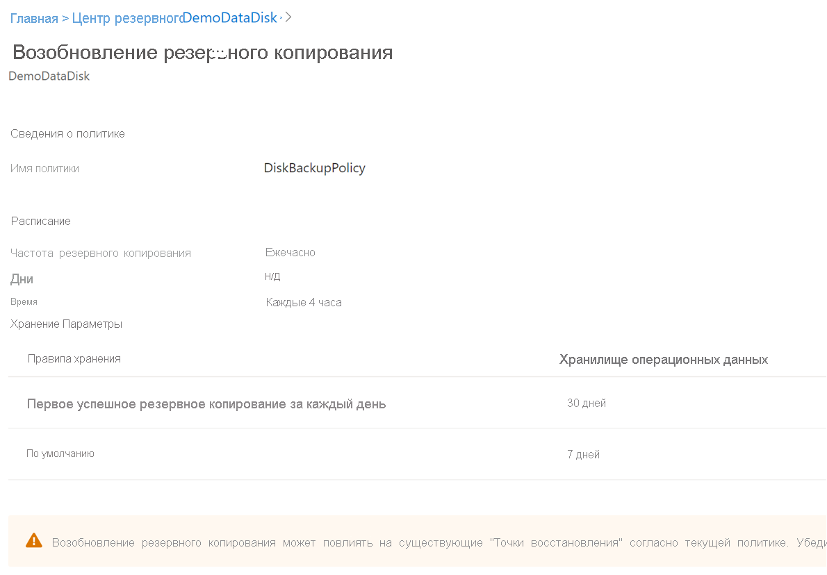 При возобновлении защиты экземпляра резервного копирования существующая политика резервного копирования начнет применяться только к новым точкам восстановления. Точки восстановления, срок хранения которых уже истек в соответствии с их первоначальной длительностью, определенной политикой резервного копирования на момент их создания, будут удалены.