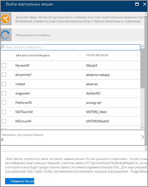 Azure Backup обнаруживает все базы данных SQL Server на виртуальной машине. Во время обнаружения в фоновом режиме происходят следующие действия: