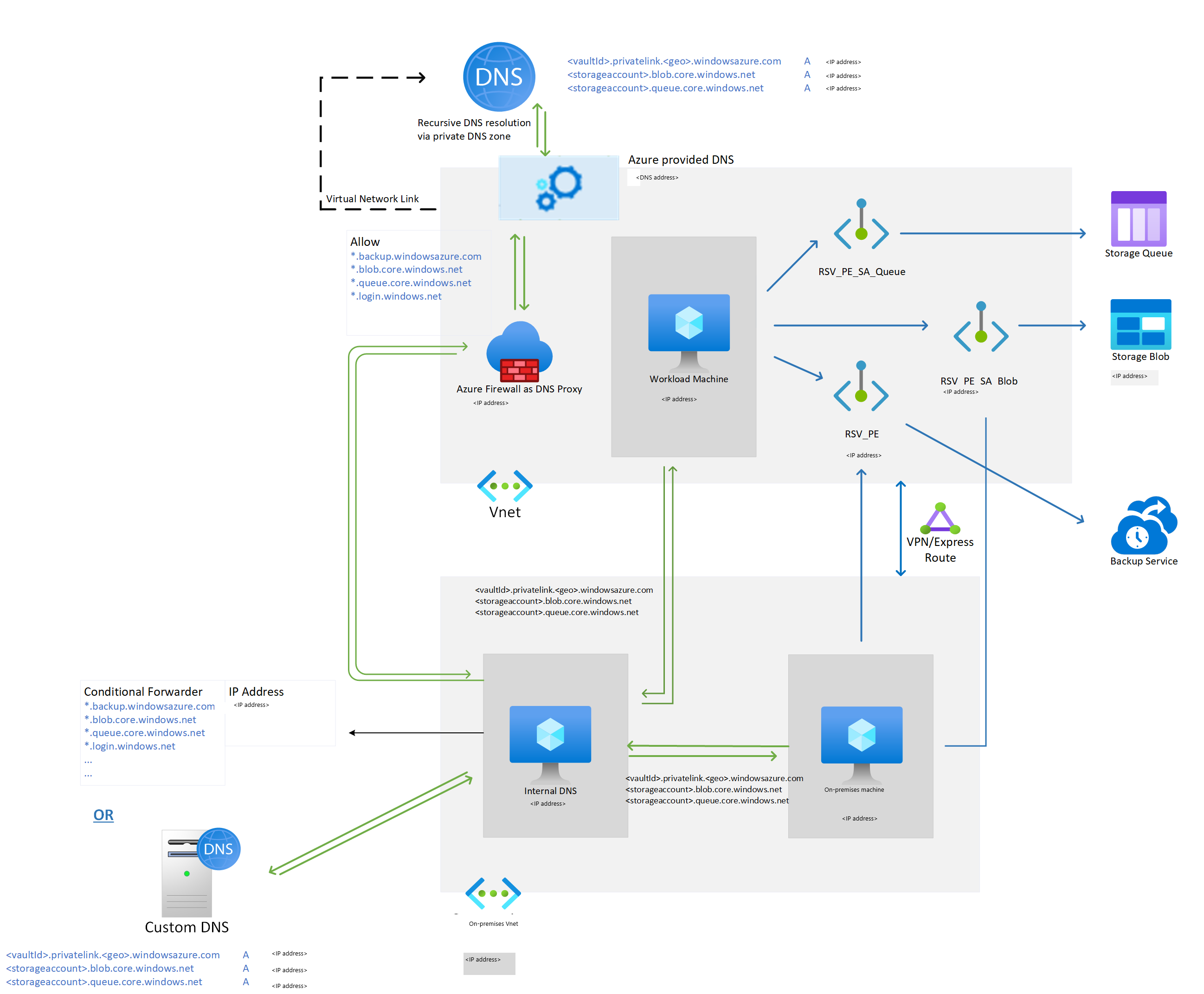 Для хранилища служб восстановления с настройкой частной конечной точки разрешение имен для полных доменных имен (privatelink.<geo>.backup.windowsazure.com, *.blob.core.windows.net, *.queue.core.windows.net, *.blob.storage.azure.net) должно возвращать частный IP-адрес. Это можно сделать с помощью: