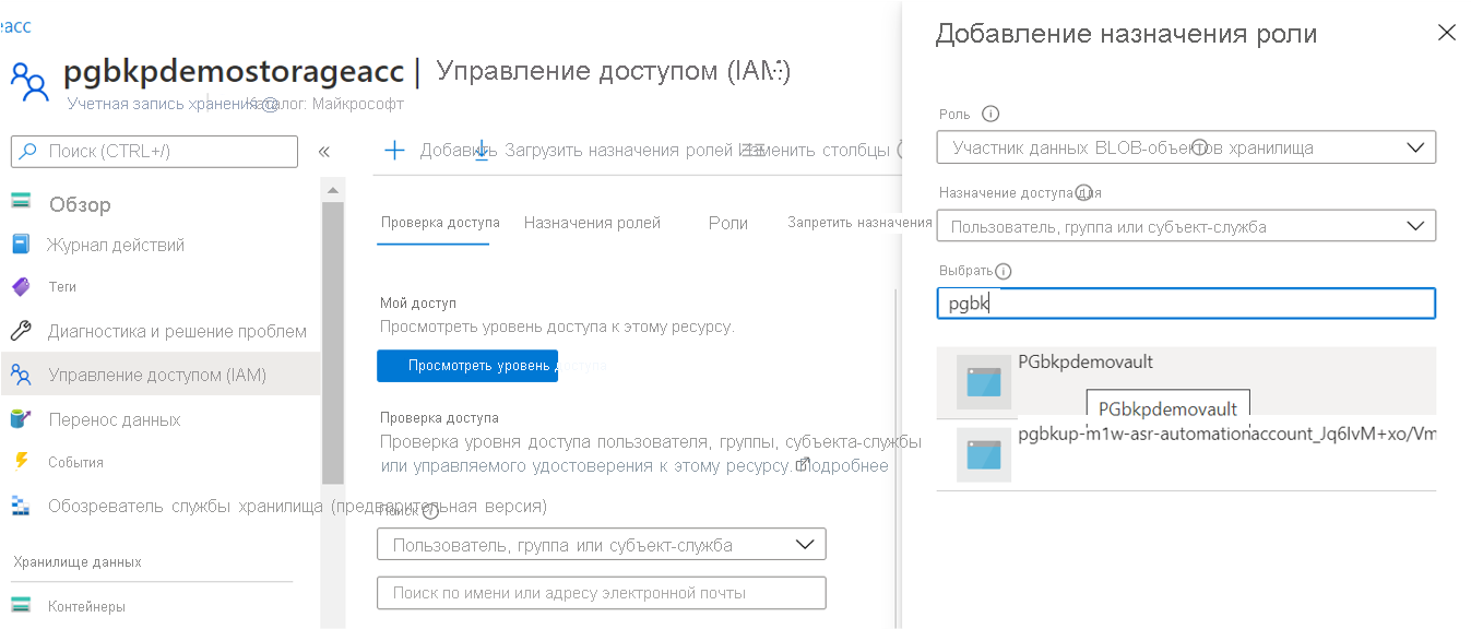 Чтобы назначить управляемому удостоверению хранилища резервных копий доступ к контейнерам учетной записи хранения, выполните следующие действия.