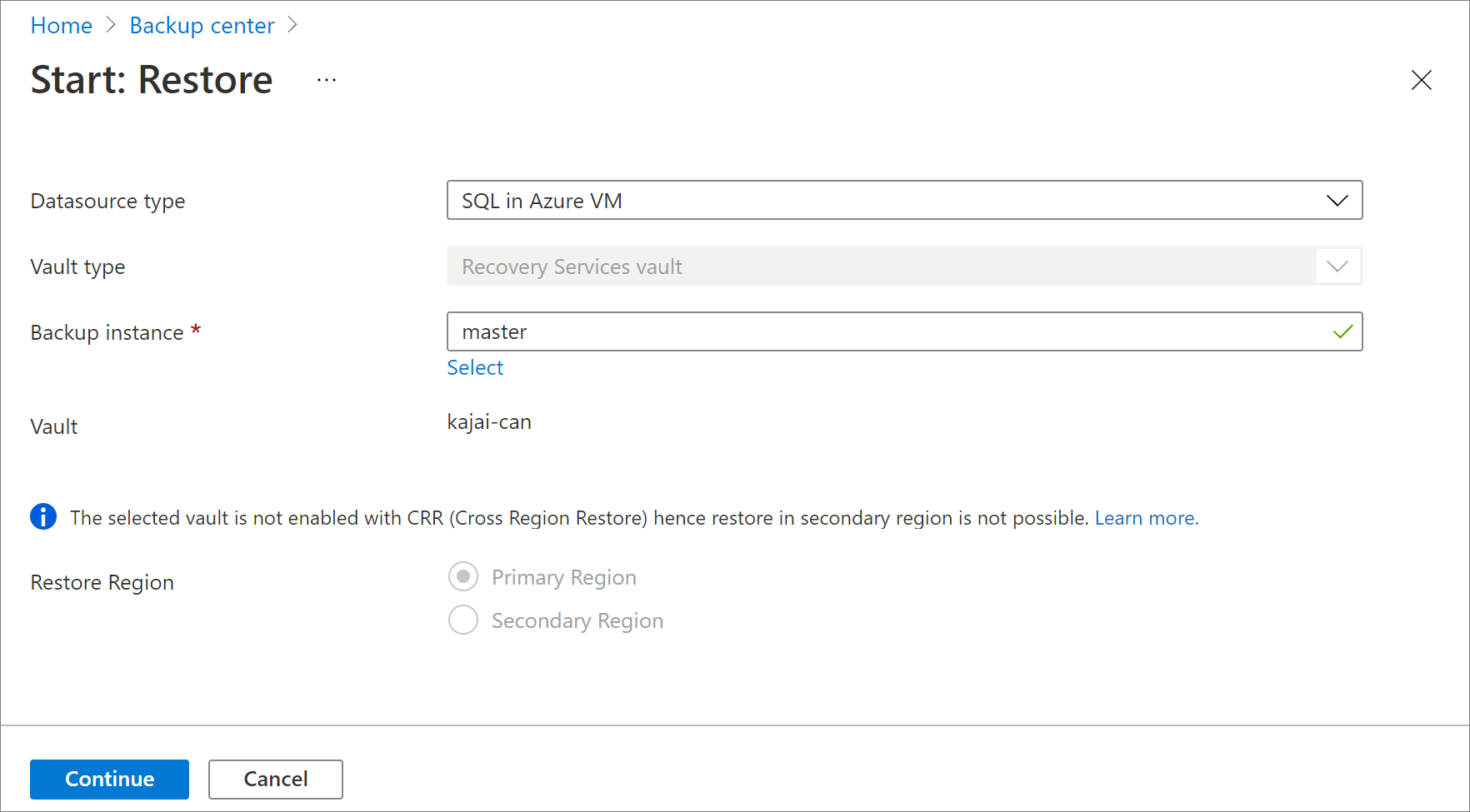 В списке отображаются только типы управления резервным копированием, поддерживающие функцию межрегиональной репликации. В настоящее время поддерживается только восстановление данных одного дополнительного региона в другом дополнительном регионе.