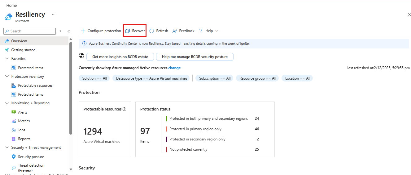 На портале Azure перейдите к устойчивости и нажмите кнопку "Восстановить".