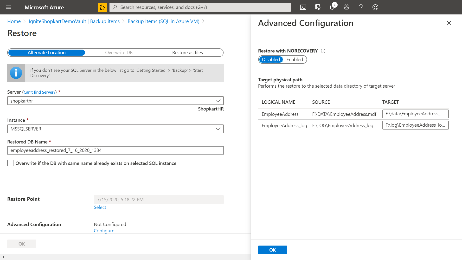 Для восстановления больших баз данных рекомендуется использовать инструкции TSQL. Если вы хотите переместить определенные файлы базы данных, просмотрите список файлов базы данных в формате JSON, созданном во время операции восстановления в качестве файлов .