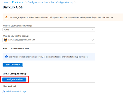 После завершения процесса обнаружения базы данных Azure Backup перенаправляется на панель "Цель резервного копирования", что позволяет настроить параметры резервного копирования для выбранной виртуальной машины, в которой размещена база данных SAP ASE.