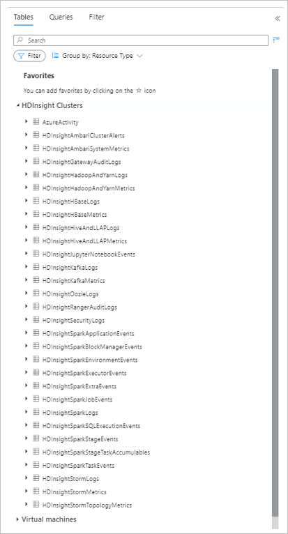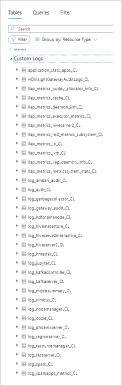 - If you group the tables by Resource Type, the tables are under the HDInsight Clusters section as shown in the image below.