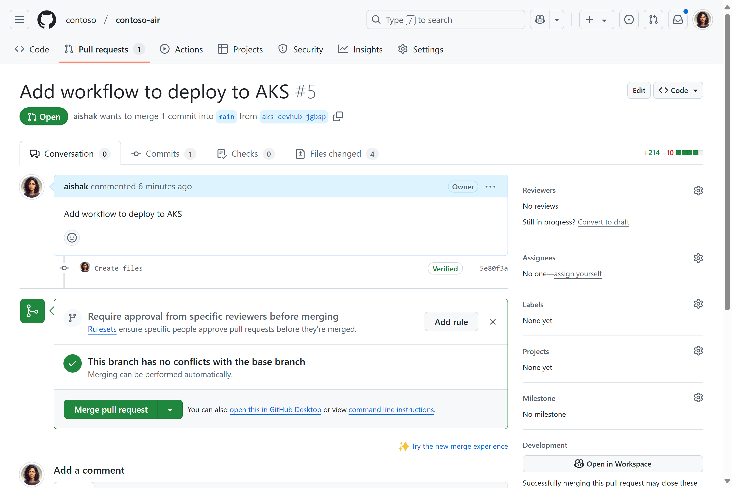 После успешного развертывания выберите Просмотреть pull request, чтобы просмотреть сведения о созданном pull request в вашем репозитории кода.