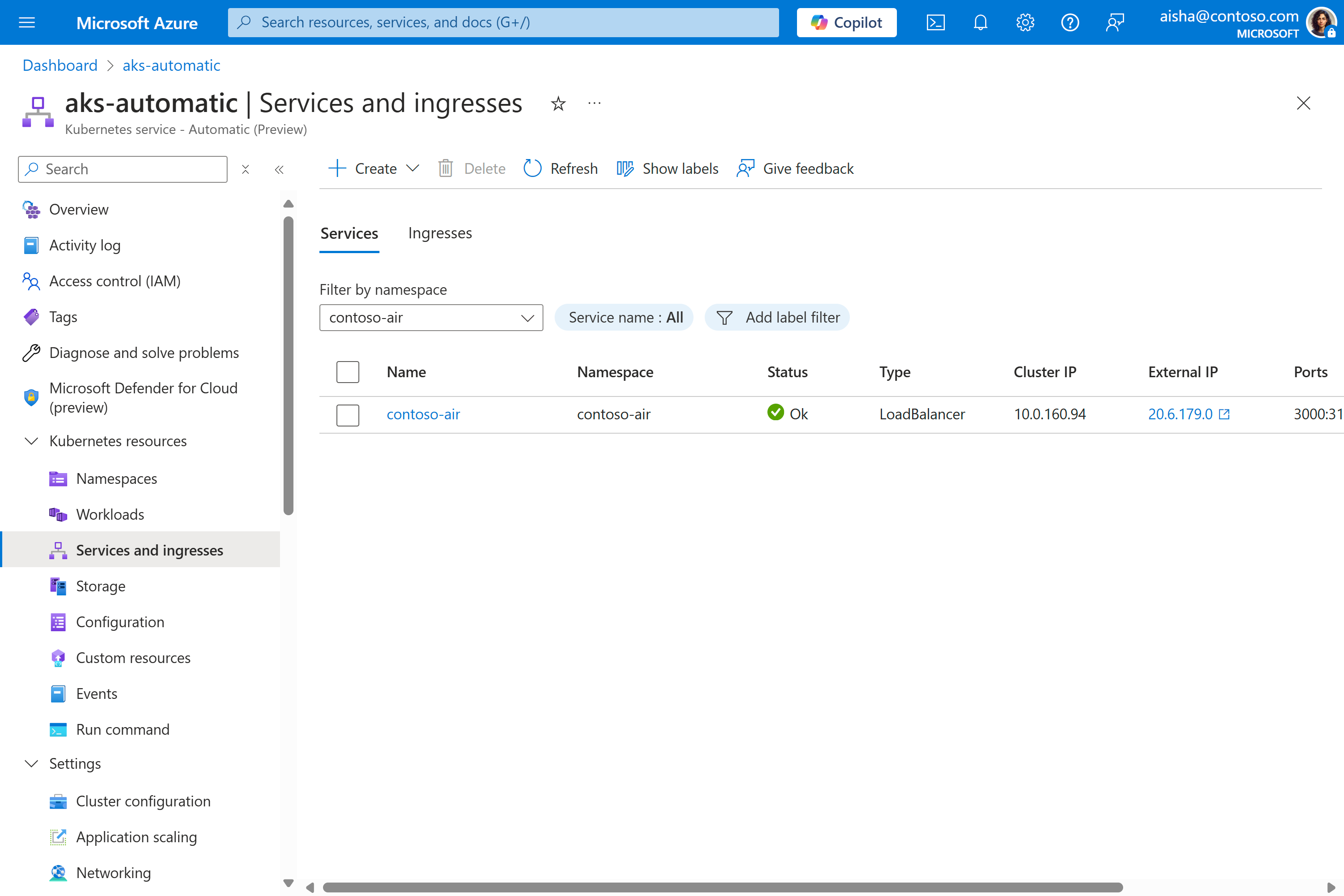 После завершения конвейера можно просмотреть созданные Kubernetes Service на портале Azure, выбрав службы и входы в разделе ресурсов Kubernetes в меню службы.