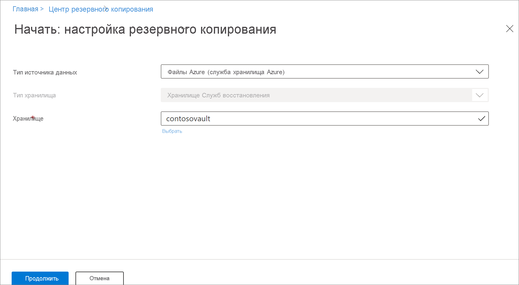 На панели "Цель резервного копирования" выберите Файлы Azure (служба хранилища Azure) в качестве типа источника данных, выберите хранилище, с которым нужно защитить общие папки, а затем нажмите кнопку "Продолжить".