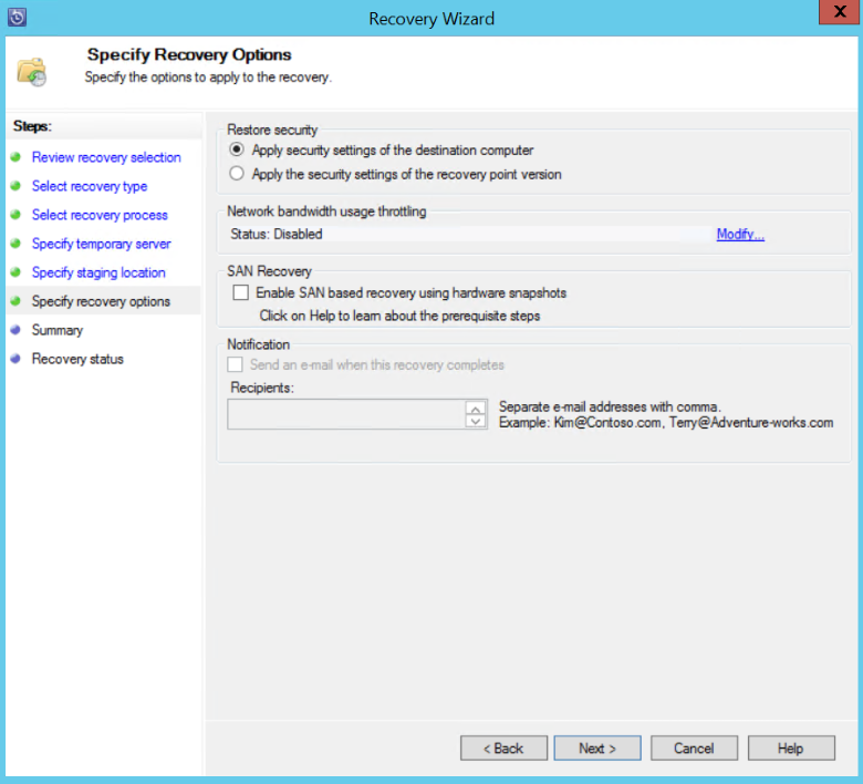 Выберите Укажите параметры восстановленияи примените параметры безопасности к ферме SharePoint или примените параметры безопасности точки восстановления. Выберите Далее.