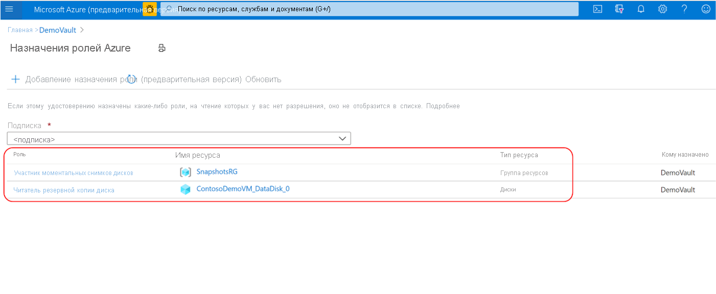 Назначьте управляемому удостоверению хранилища Backup роль Участник моментальных снимков дисков в группе ресурсов, где служба Azure Backup создает и управляет резервными копиями. Моментальные снимки диска сохраняются в группе ресурсов в вашей подписке. Чтобы служба Azure Backup могла создавать, сохранять и управлять моментальными снимками, необходимо предоставить разрешения на доступ к хранилищу резервных копий.