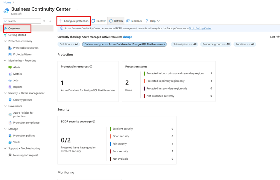 Перейдите в Центр непрерывности бизнес-процессов и выберите "Обзор>+ Настройка защиты".