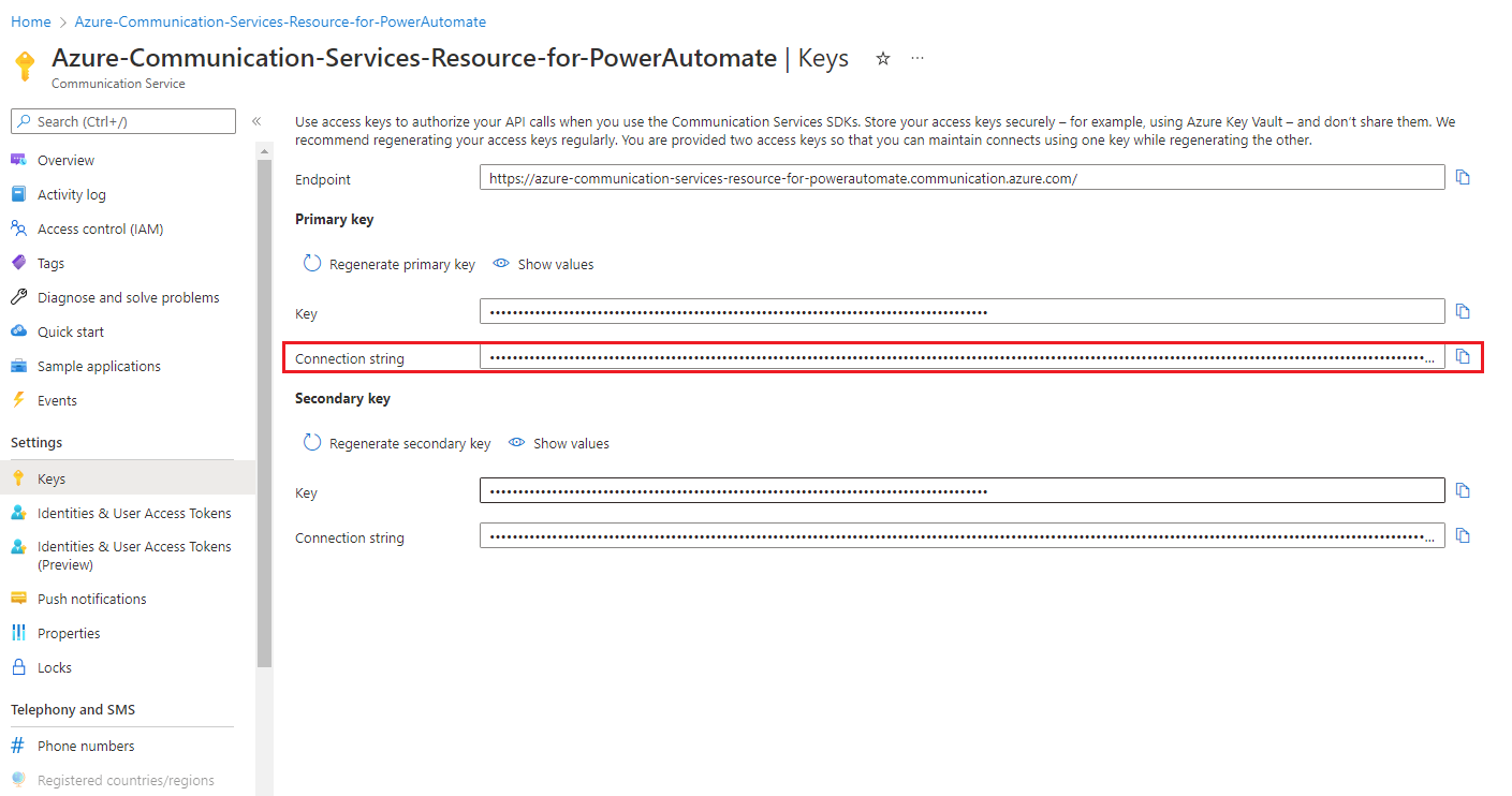 Введите строка подключения. Чтобы получить URL-адрес строки подключения в портале Azure, перейдите к ресурсу Службы связи Azure. В меню ресурсов выберите "Ключи" и выберите строку подключения. Щелкните значок копирования, чтобы скопировать строку подключения.