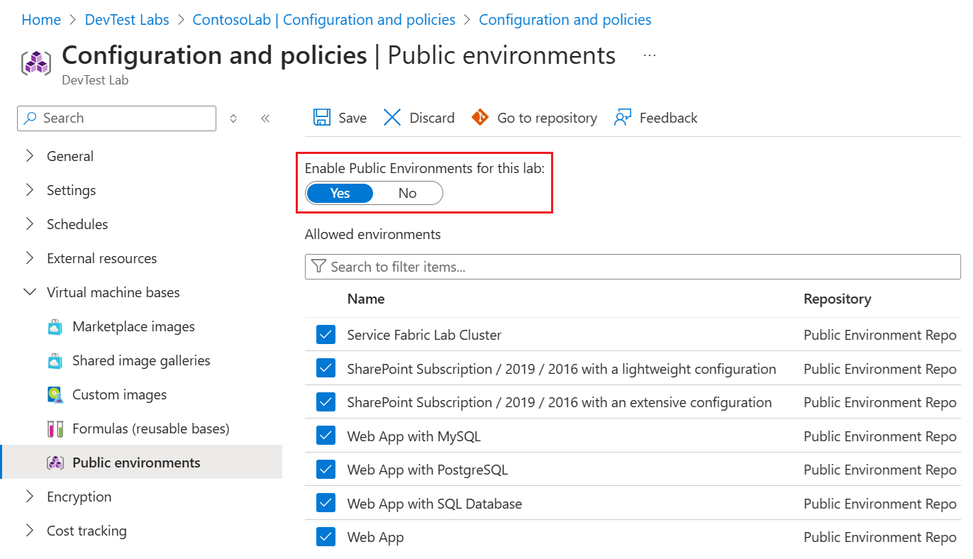 На странице "Общедоступные среды " задайте для параметра "Включить общедоступные среды" для этого параметра лаборатории значение "Да " или "Нет".