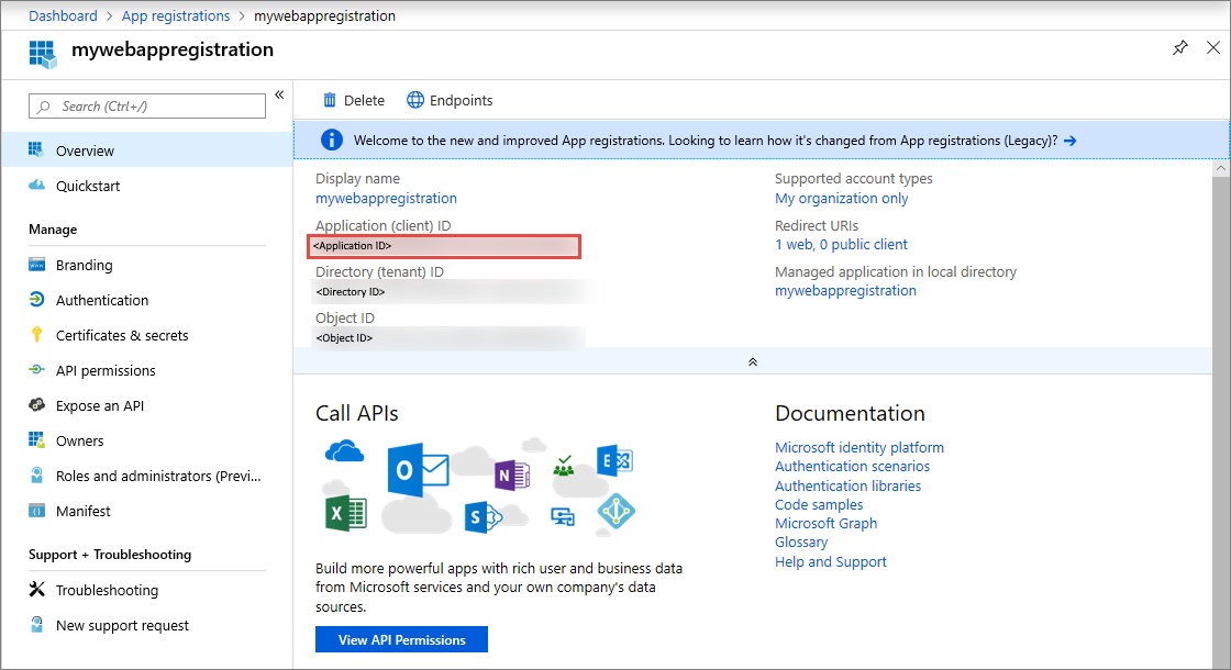 При регистрации клиентского приложения вы предоставляете сведения о приложении. Идентификатор Microsoft Entra предоставляет идентификатор клиента, который также называется идентификатором приложения для связывания приложения с средой выполнения Microsoft Entra. Дополнительные сведения об идентификаторе клиента см. в разделе «Объекты приложения и субъекта-службы в Microsoft Entra ID».