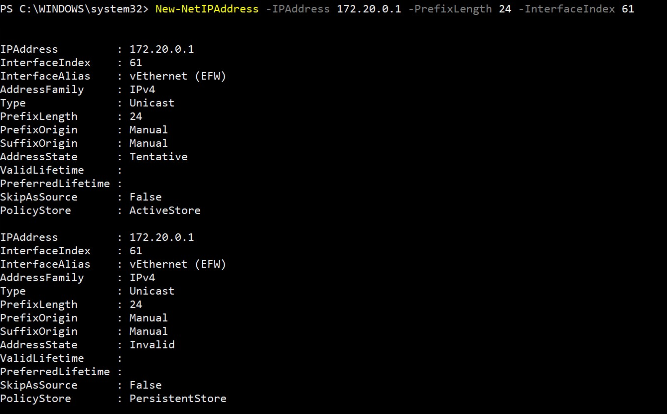 New-NetIPAddress -IPAddress {gatewayIp} -PrefixLength 24 -InterfaceIndex {interfaceIndex}Выполнение этой команды должно выводить сведения, аналогичные следующему примеру: