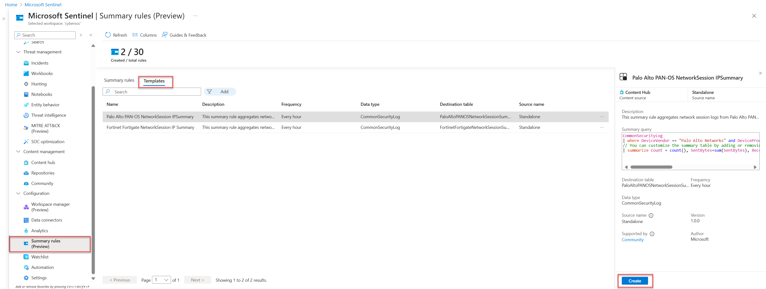 Откройте концентратор контента и отфильтруйте тип контента по правилам сводки , чтобы просмотреть доступные шаблоны правил сводки.