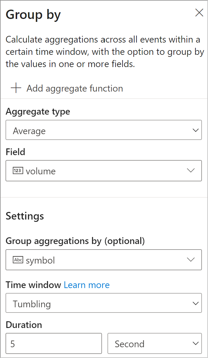- На следующем шаге необходимо указать поле и статистическое выражение, которое требуется вычислить, например, Average или Count. Вы также можете указать поле, по которому требуется выполнить группирования, и временное окно. Затем можно проверить результаты выполнения шага в разделе предварительного просмотра данных.