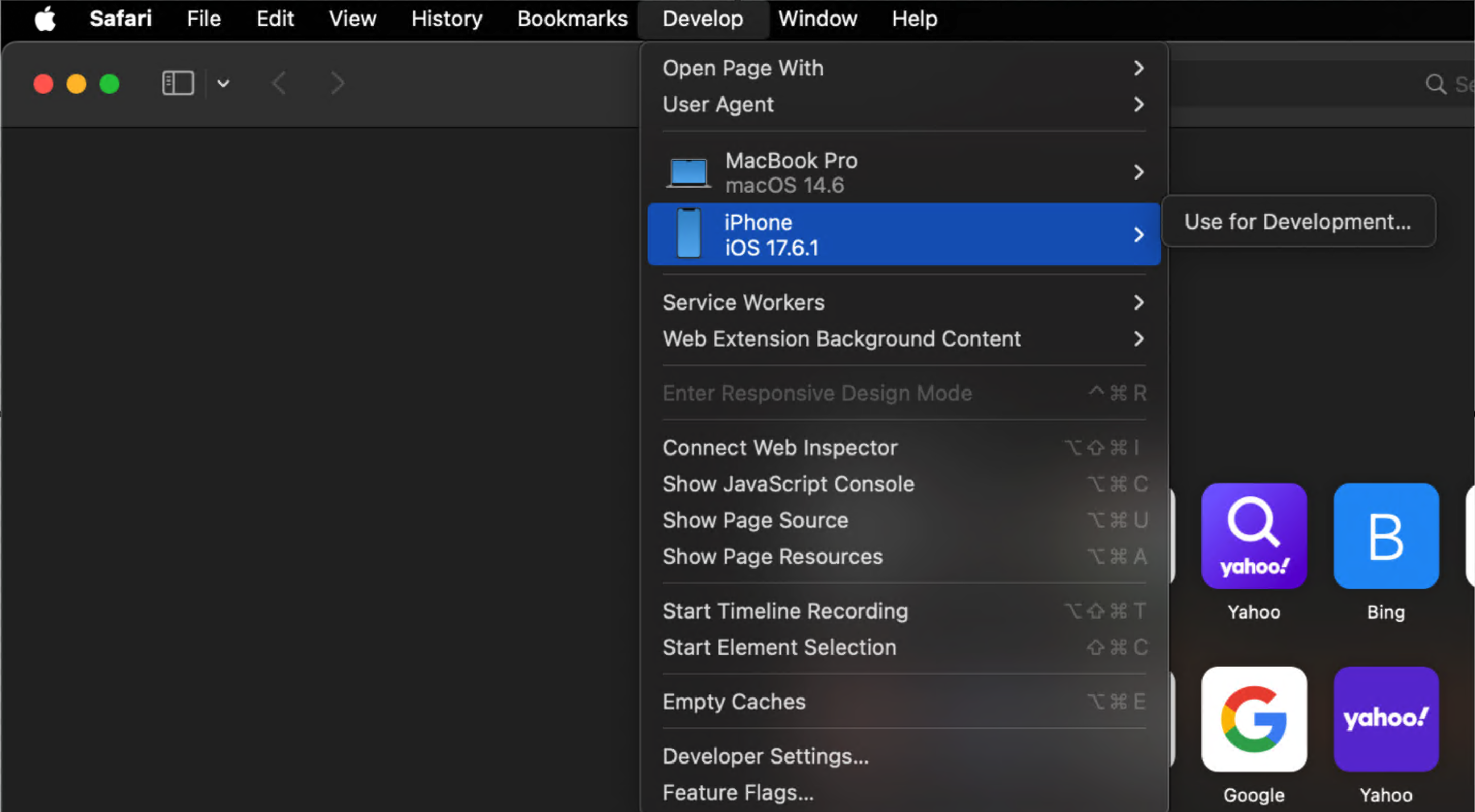 В меню Разработка Safari в системе Mac выберите Использовать для разработки... для клиента iOS. Это одноразовый параметр, который вы настраиваете при первом использовании Safari для доступа к DevTools для клиента iOS.