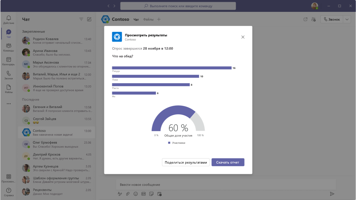 В этом примере показаны результаты опроса, запущенного с адаптивной карточки. Опрос также можно поместить в диалоговое окно.