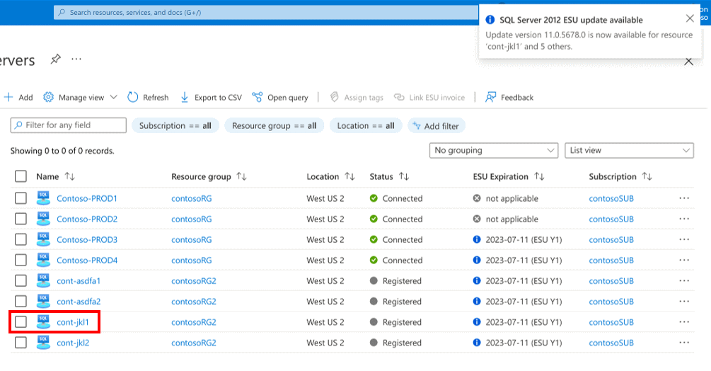 Выполните следующие действия, чтобы связать счет ESU с экземплярами Azure Arc SQL Server, чтобы получить доступ к расширенным обновлениям. Этот пример включает подключенные и зарегистрированные серверы.
