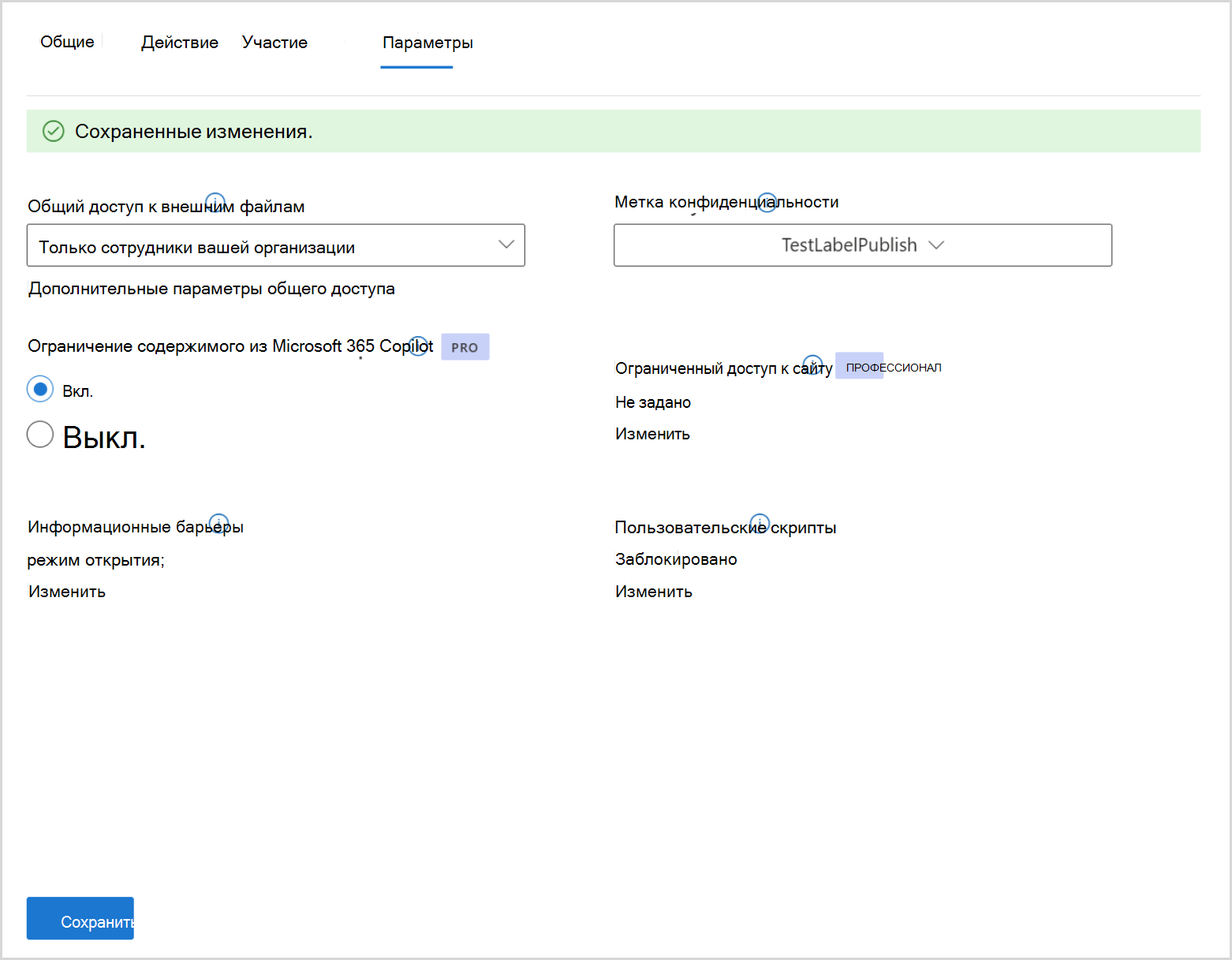 - На вкладке Параметры включите или выключите переключатель в разделе Ограничение содержимого из Microsoft 365 Copilot.