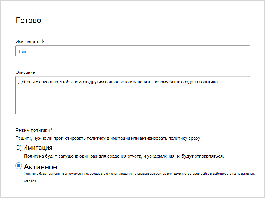 Назовите политику, добавьте описание (необязательно) и выберите режим политики. Нажмите Готово. Теперь вы можете просматривать политику и управлять ею на панели мониторинга управления жизненным циклом > сайта Неактивная политика сайта .