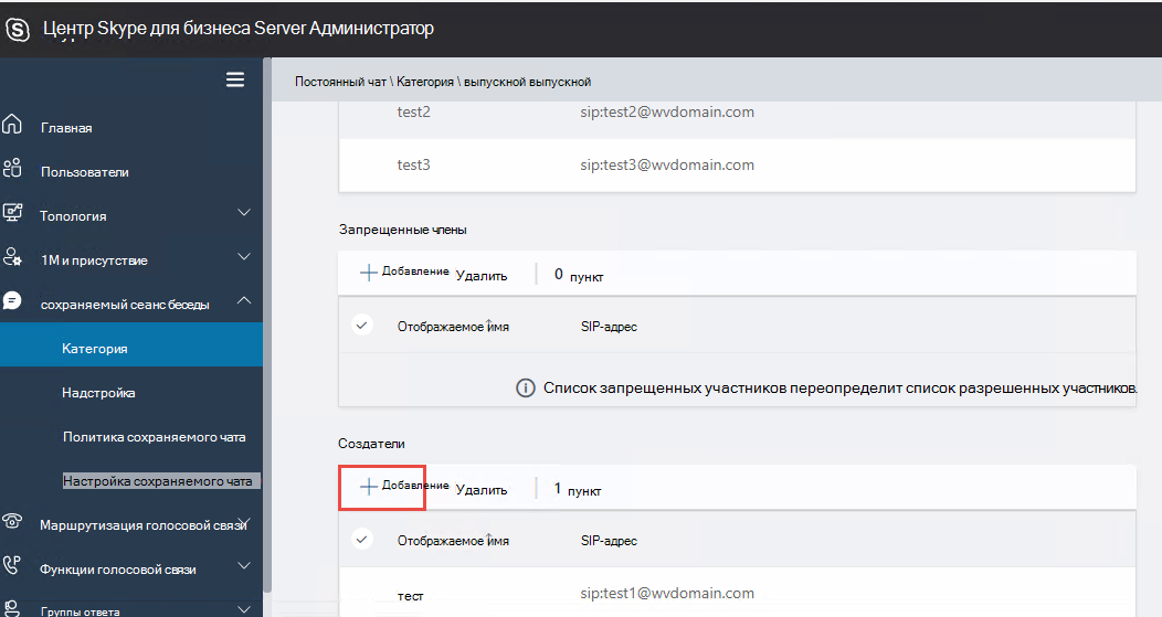 Перемещение пользователей с Skype для бизнеса Server 2015 на Skype для бизнеса Server 2019 с помощью раздела Пользователи в статье Современная Администратор панель управления (MACP).Добавьте пользователей в качестве создателей:
