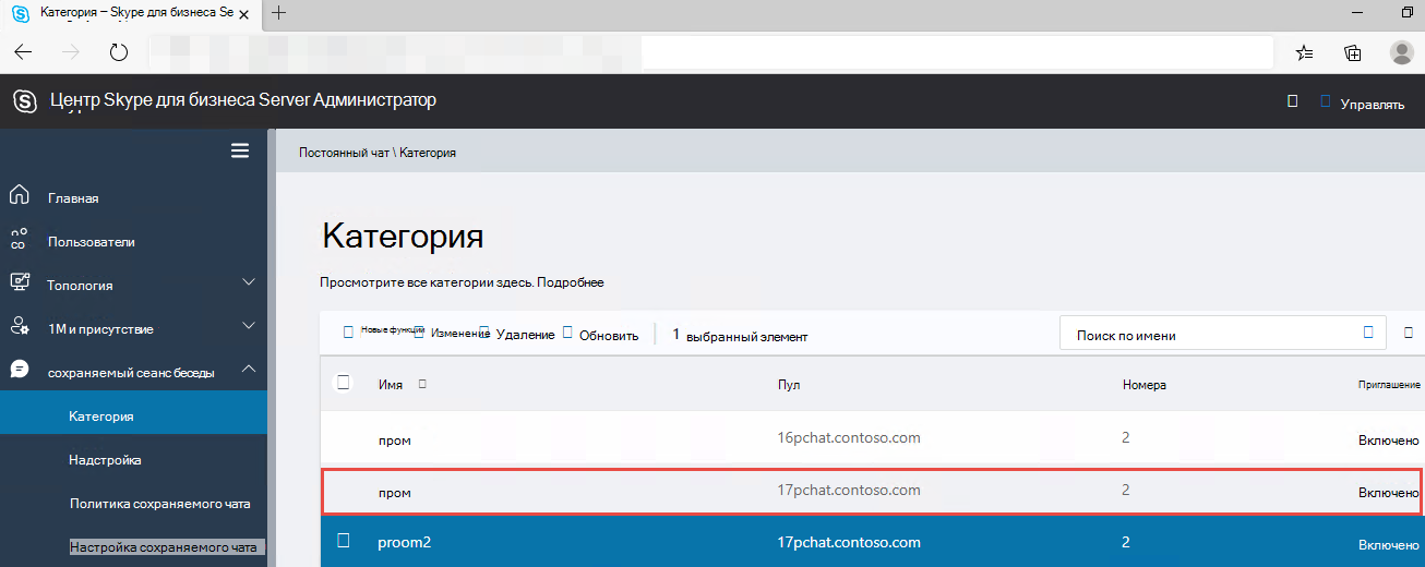 Проверка повторяющихся категорий в Skype для бизнеса Server 2019 г. После импорта базы данных убедитесь, что повторяющиеся категории из Skype для бизнеса Server 2015 созданы в Skype для бизнеса Server 2019 г. Это можно проверить в современной Администратор панель управления (MACP).