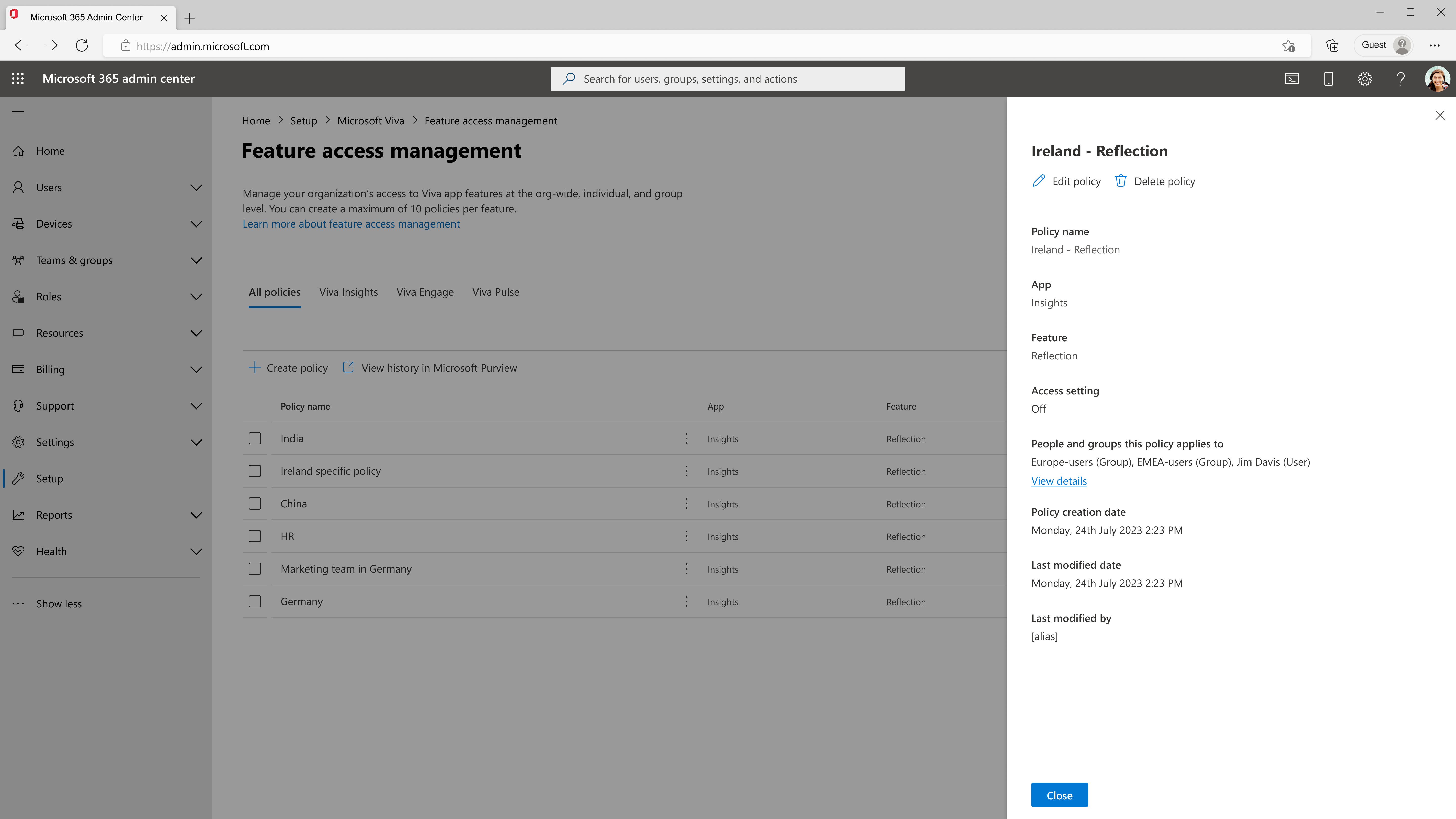 - При удалении удостоверений пользователей в Microsoft Entra ID данные пользователей удаляются из Viva управления доступом к функциям. Если удостоверения пользователей повторно включены в течение периода обратимого удаления, администратору необходимо переназначить политики пользователю.