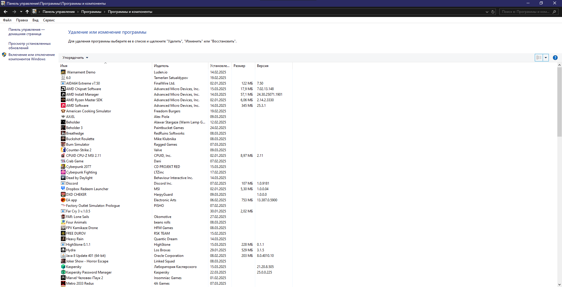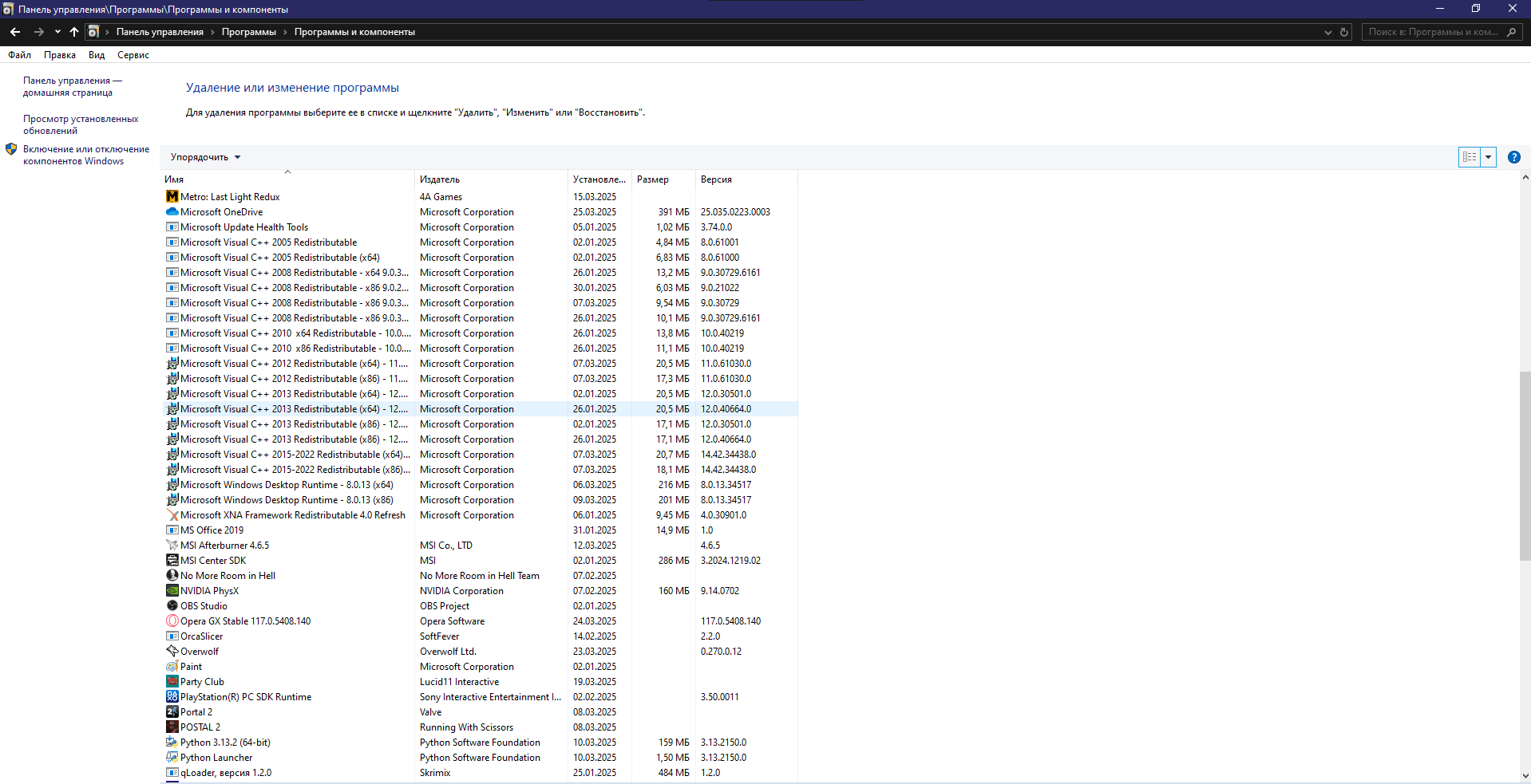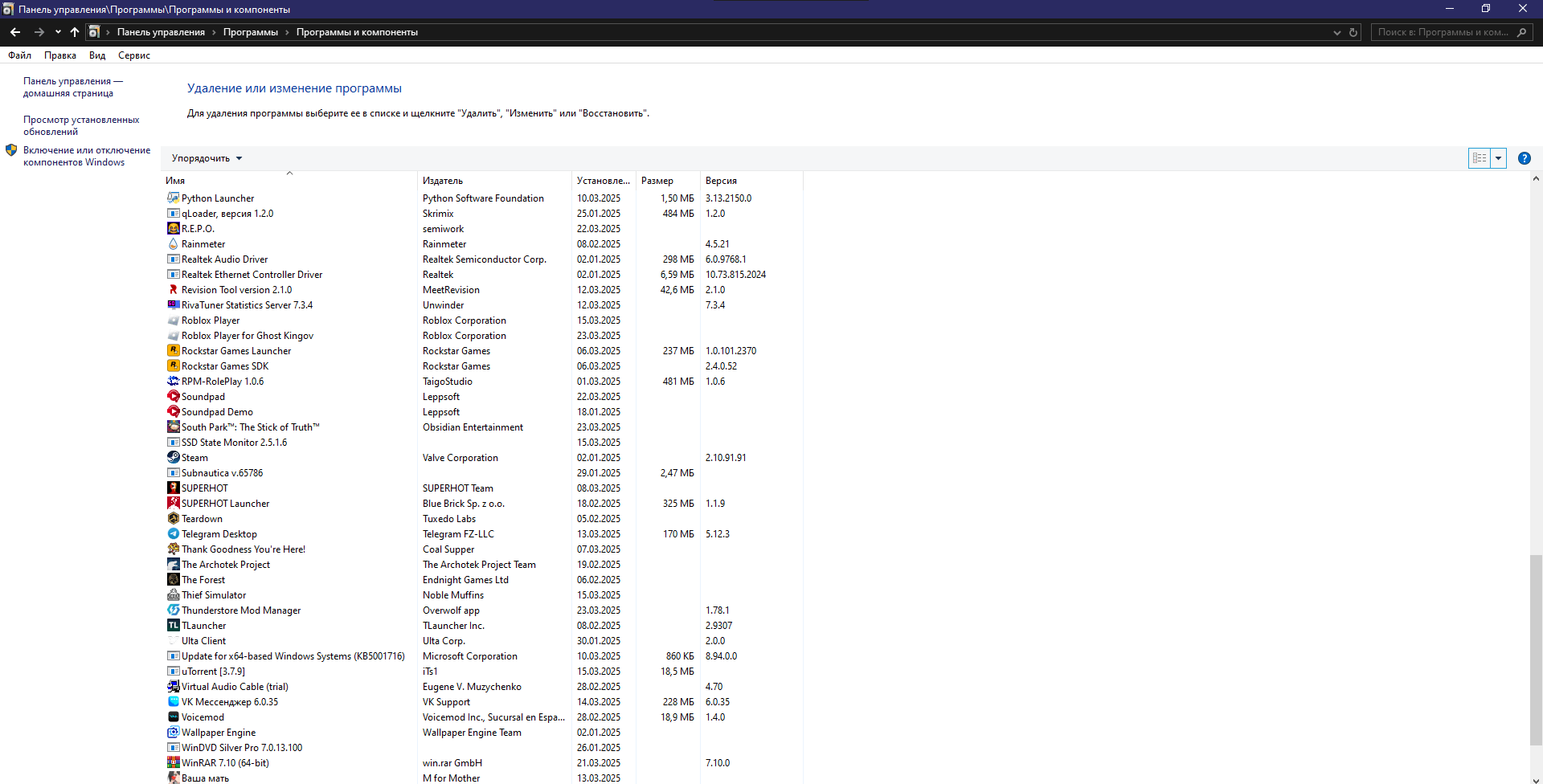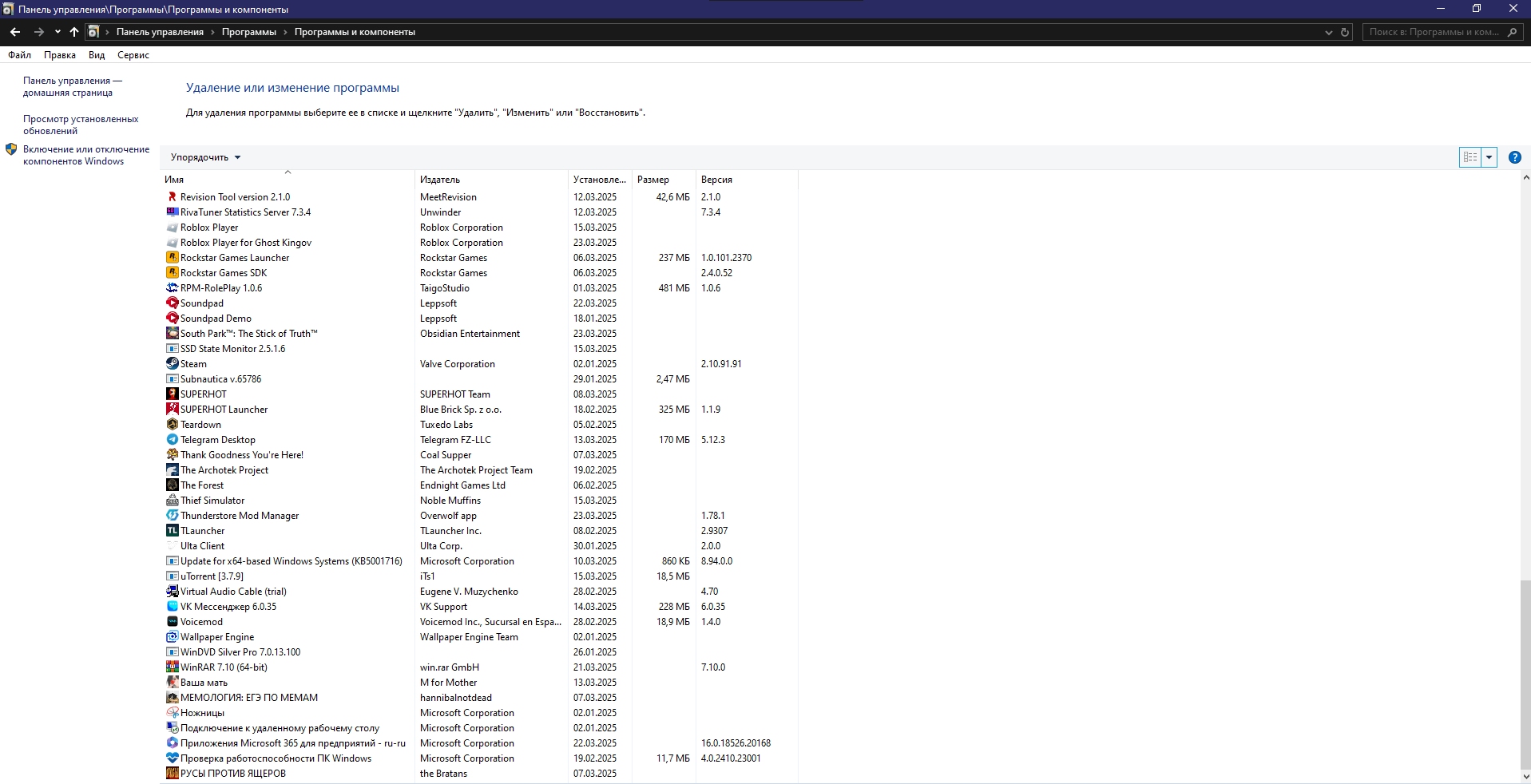- Окна Панель управления-Программы и компоненты со списком всех установленных программ.