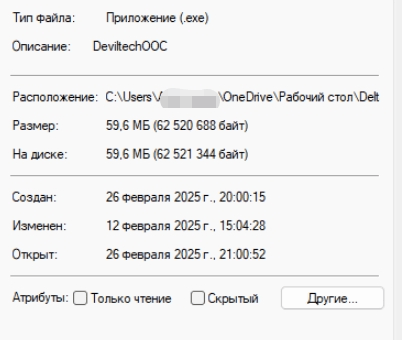 Далее, учитывая путь к файлу 'C:\Users\***\OneDrive\Рабочий стол\Delt', могут быть зависимости или разрешения, влияющие на его выполнение. Так как он расположен в OneDrive, этому могут способствовать проблемы с синхронизацией или разрешениями. Автоматическая синхронизация OneDrive может повлиять на права доступа к исполняемому файлу, особенно если файл еще не полностью синхронизирован. Было бы полезно убедиться, что файл полностью загружен и доступен без каких-либо ограничений OneDrive.