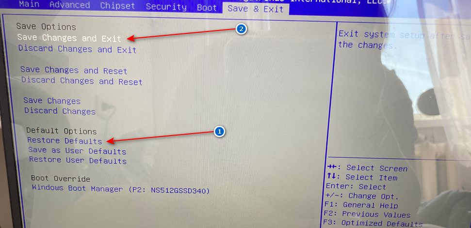 Если нет, загрузите ноутбук в BIOS, найдите опцию восстановления настроек BIOS по умолчанию и примените ее, сохраните эти настройки и перезагрузите ноутбук, загружается ли он в Windows нормально?
