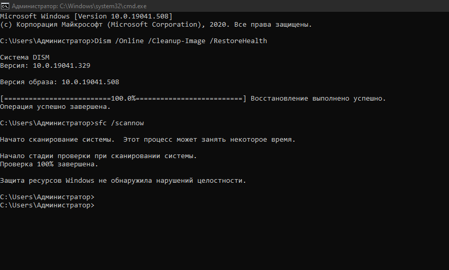 Нажмите Win+X, выберите командная строка(администратор) или PowerShell(администратор). В открывшемся окне напечатайте Dism /Online /Cleanup-Image /RestoreHealth и нажмите Enter.