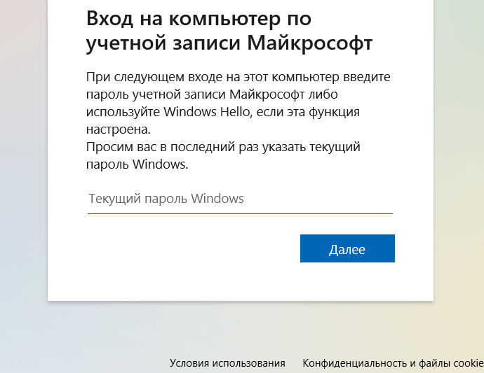Введите текущий пароль вашей локальной учетной записи. Если пароля нет, оставьте поле пустым и нажмите Далее.